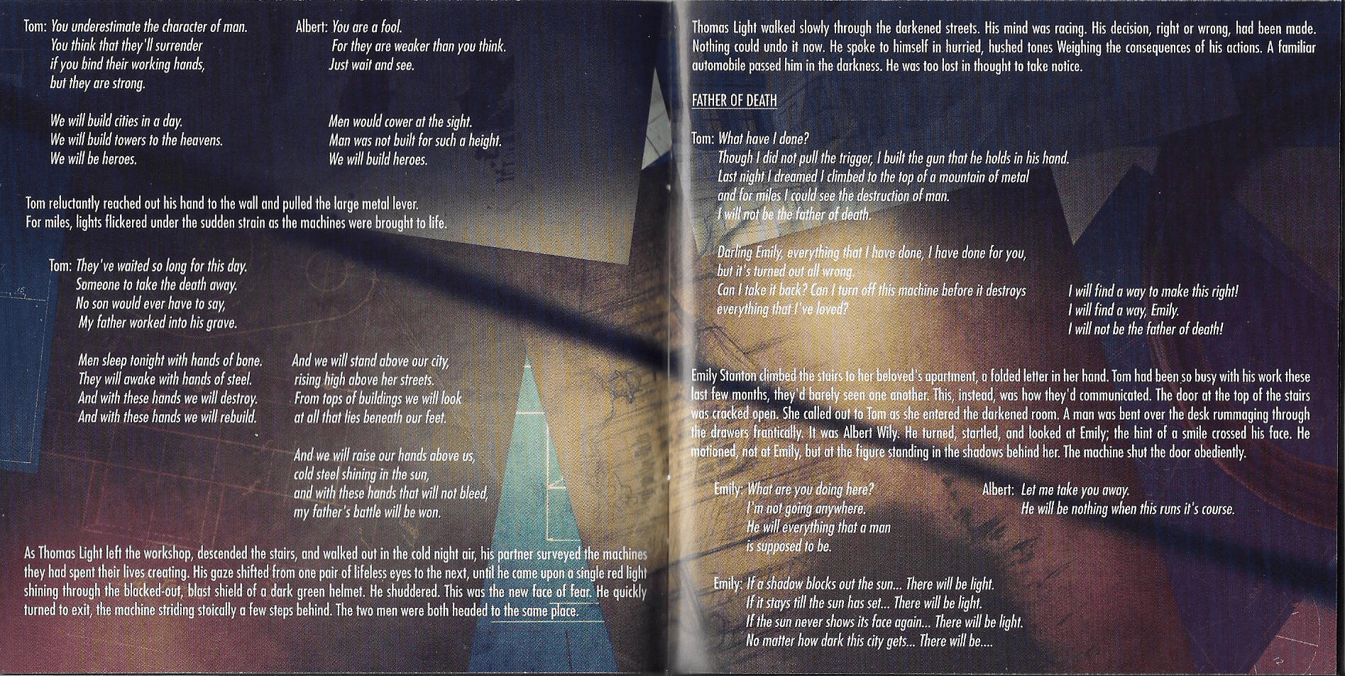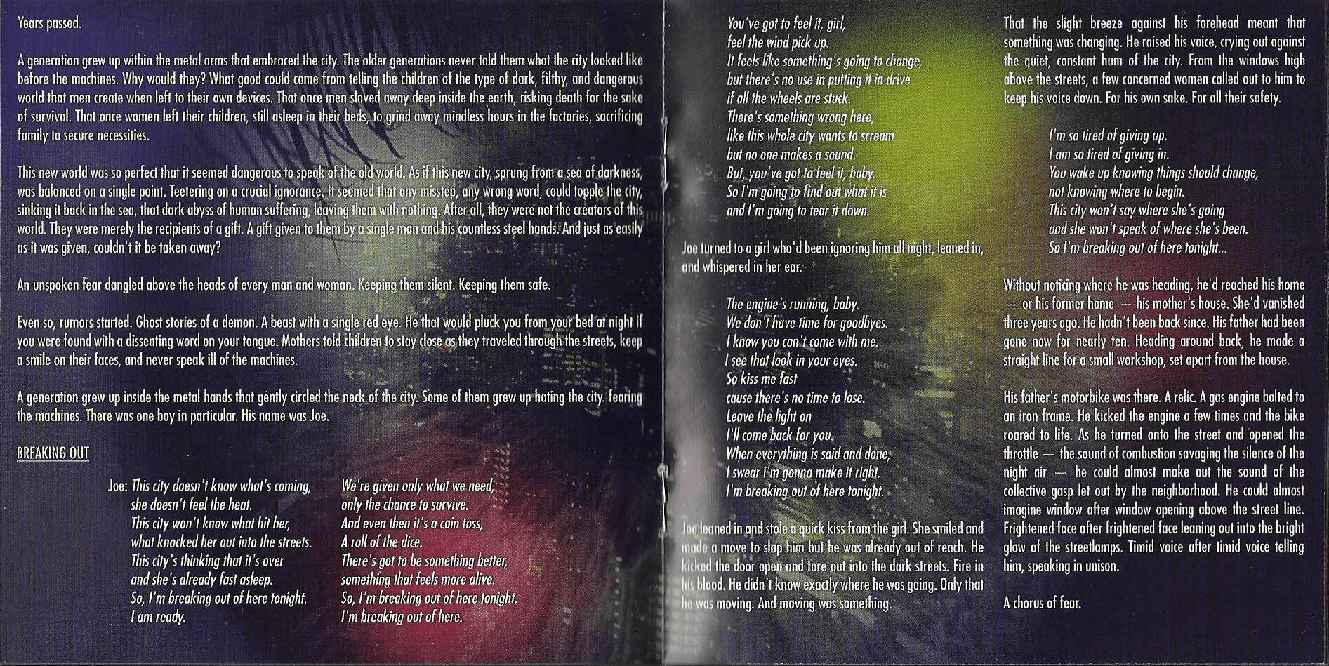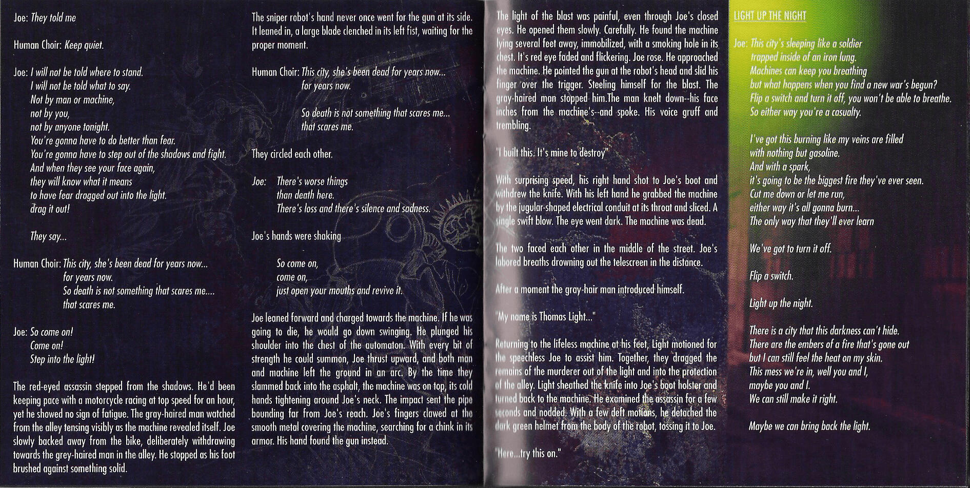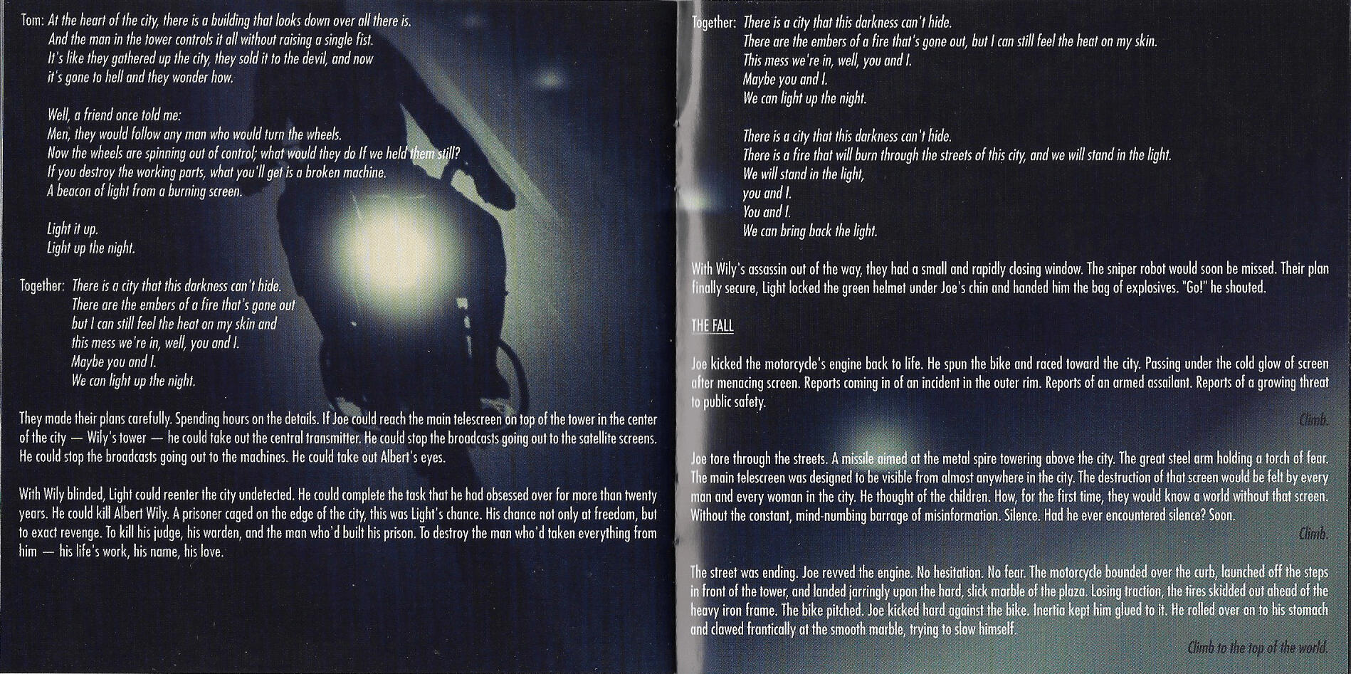 For new listeners, please note:The liner notes to these albums are designed to be read as you are listening to the song. Heavy areas of text are usually accompanied by instrumental sections.For slow readers, it might be ideal to read liner notes before or after a song if you are worried that pausing the song might break up your pace.Act II is a prequel to Act I, so events in Act I actually take place later than those in Act II."Act I" is officially a self titled album, but with the release of Act II, the album is now referred to by fans and the band as "Act I".When listening to Act II, Tom's letter is meant to be read during intermission.The "Light Up The Night" short film is not necessarily canon to the events of Act II, but are one interpretation.This site is designed to present lyrics and liner notes as they were published. Not all lyric sites include all details of the original lyric books.