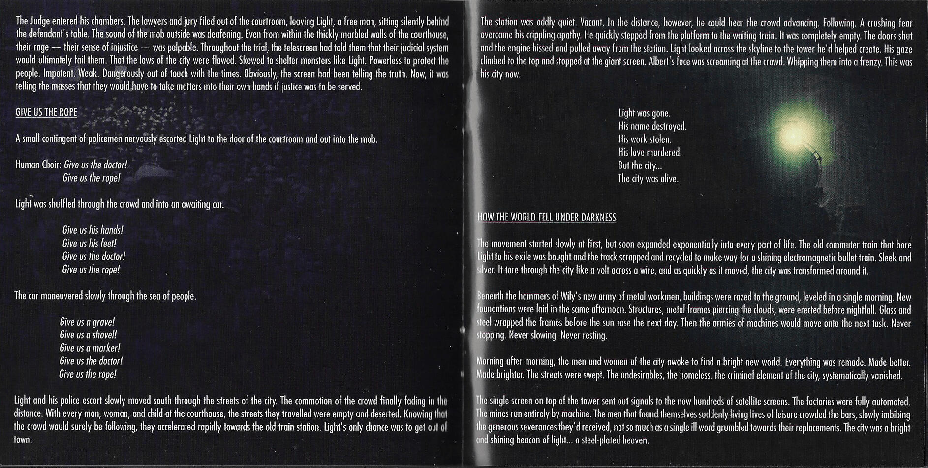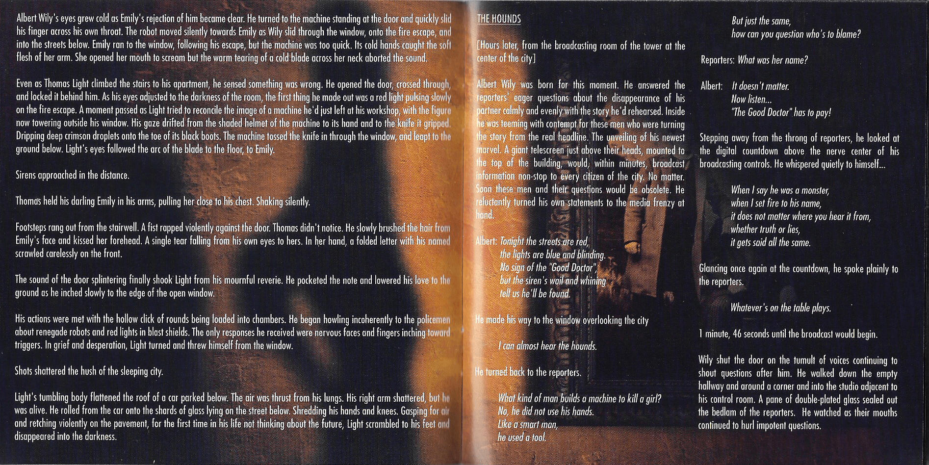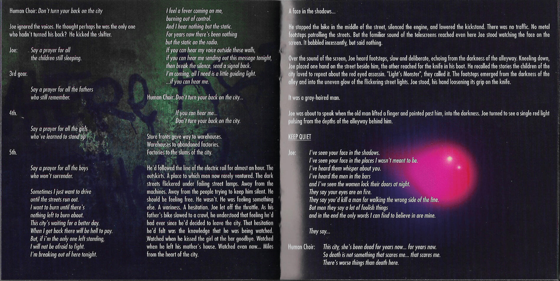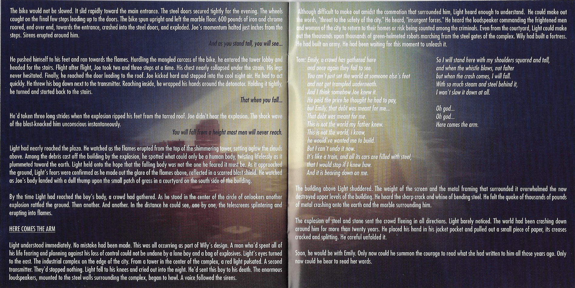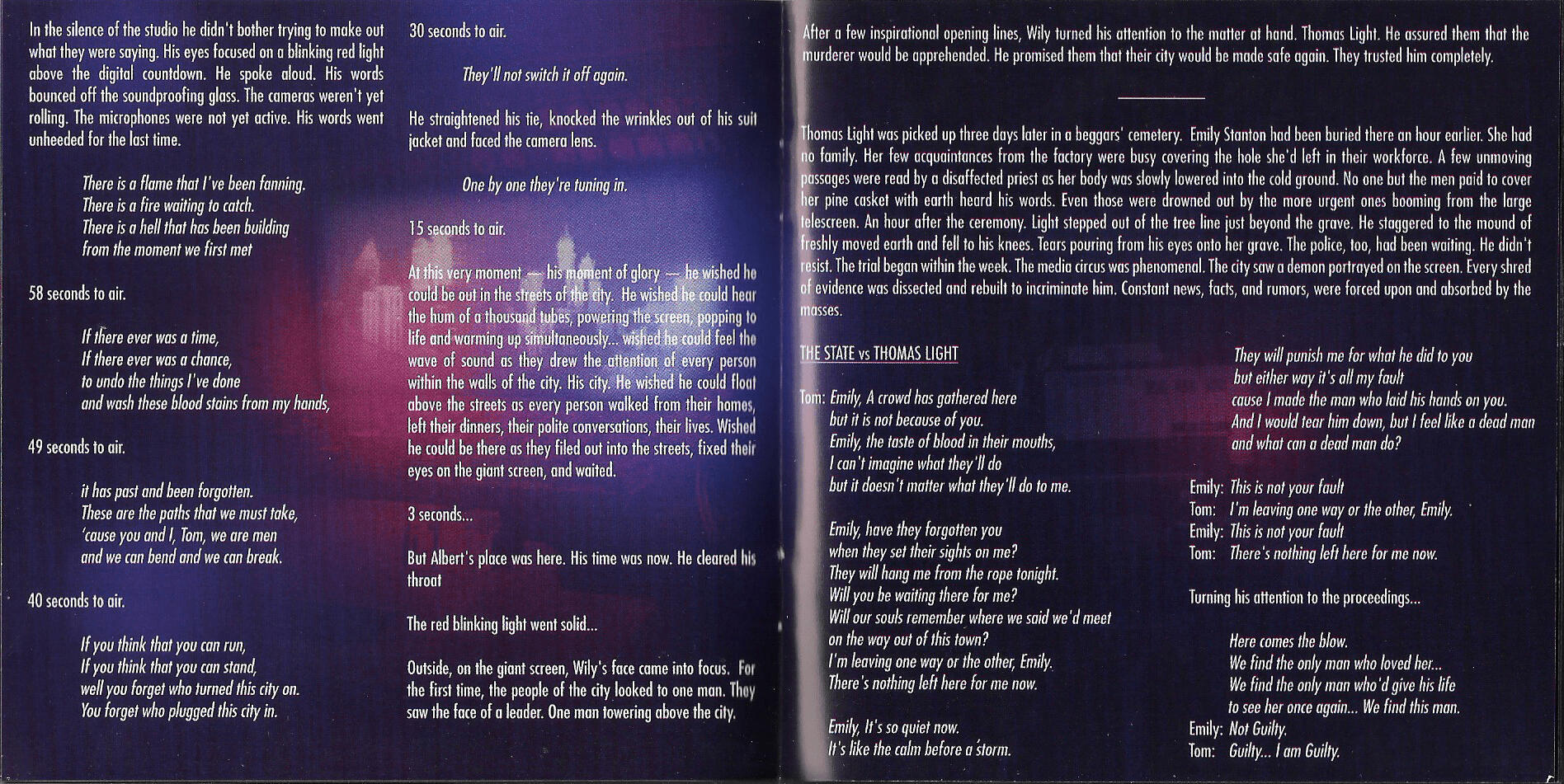 For new listeners, please note:The liner notes to these albums are designed to be read as you are listening to the song. Heavy areas of text are usually accompanied by instrumental sections.For slow readers, it might be ideal to read liner notes before or after a song if you are worried that pausing the song might break up your pace.Act II is a prequel to Act I, so events in Act I actually take place later than those in Act II."Act I" is officially a self titled album, but with the release of Act II, the album is now referred to by fans and the band as "Act I".When listening to Act II, Tom's letter is meant to be read during intermission.The "Light Up The Night" short film is not necessarily canon to the events of Act II, but are one interpretation.This site is designed to present lyrics and liner notes as they were published. Not all lyric sites include all details of the original lyric books.