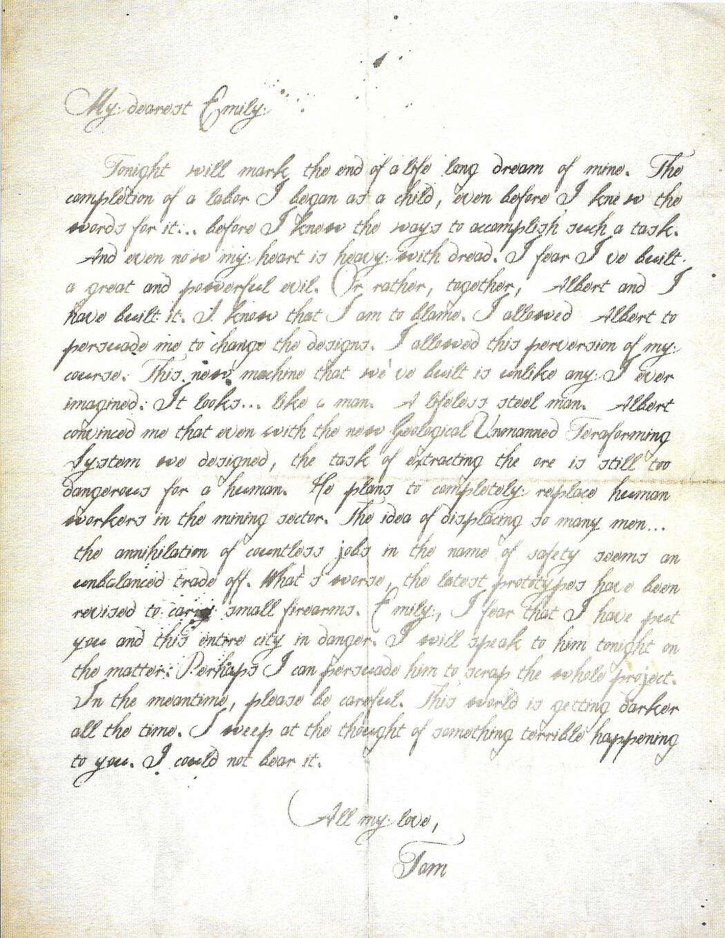 Tonight will mark the end of a life long dream of mine.The completion of a labor I began as a child, even before I knew the words for it... before I knew the ways to accomplish such a task. And even now my heart is heavy with dread. I fear I've built a great and powerful evil. Or rather, together, Albert and I have built it. I know that I am to blame. I allowed Albert to persuade me to change the designs. I allowed this perversion of my course. This new machine that we've built is unlike any I ever imagined. It looks... like a man. A lifeless steel man. Albert convinced me that even with the new Geological Unmanned Terraforming System we designed, the task of extracting the ore is still too dangerous for a human. He plans to completely replace human workers in the mining sector. The idea of displacing so many men... the annihilation of countless jobs in the name of safety seems an unbalanced trade off. What is worse, the latest prototypes have been revised to carry small firearms. Emily, I fear that I have put you and this entire city in danger. I will speak to him tonight on the matter. Perhaps I can persuade him to scrap the whole project. In the meantime, please be careful. This world is getting darker all the time. I weep at the thought of something terrible happening to you. I could not bear it.