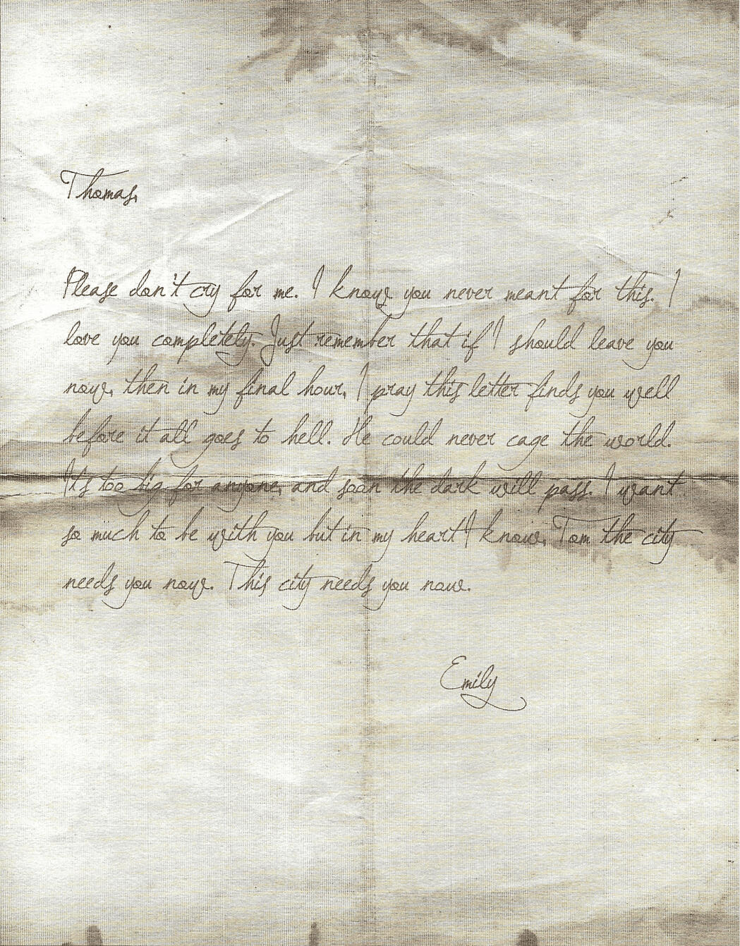 I know you never meant for this. I love you completely. Just remember that if I should leave you now, then in my final hour, I pray this letter finds you well before it all goes to hell. He could never cage the world. It's too big for anyone, and soon the dark will pass. I want so much to be with you but in my heart I know, Tom the city needs you now. This city needs you now.